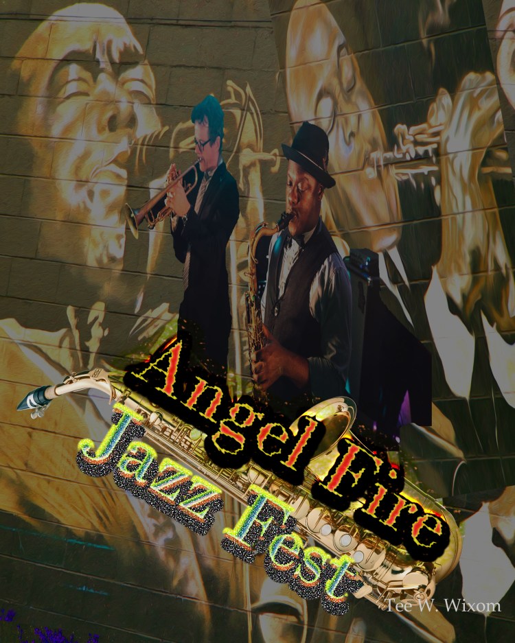 This is a promo for the Angel Fire Jazz Fest. I used an image of brick mural of the jazz greats along with an image of a random jazz band. The background images have reduced opacity and blending modes effect. The words “Angel Fire” have the flame effect on them. The words “Jazz Fest” have drop shadow and pointillize effect on them.