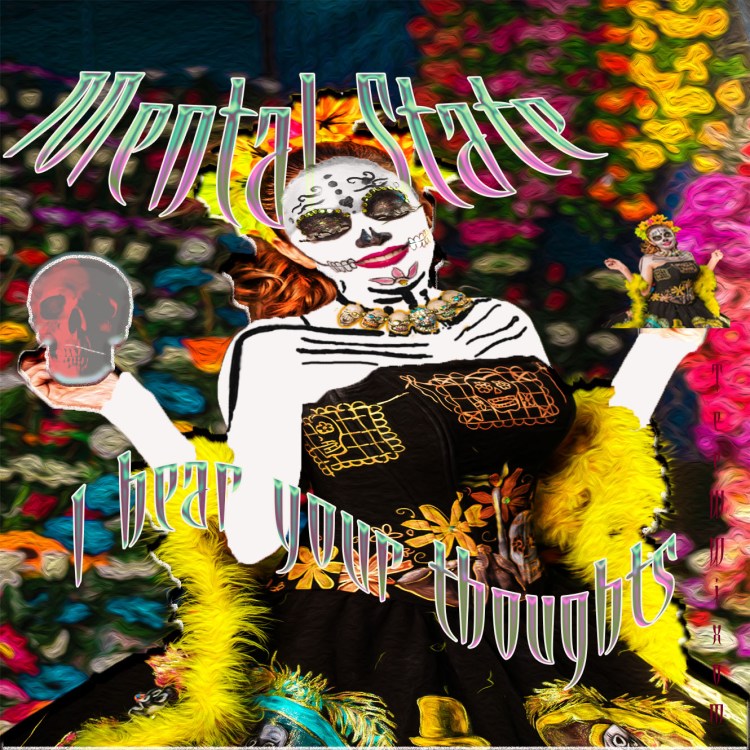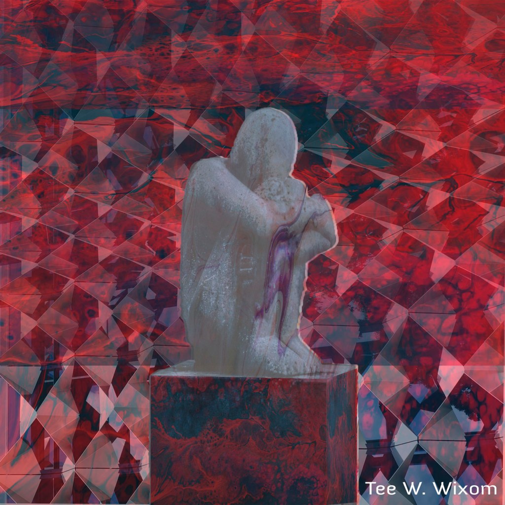 My objective was to create a chaotic/serene image with this image. There are two layers in the background. The first layer is angled mirrored glass like of the Epcot Center in Florida. The next layer in the background is the same layer which is around the cube for the statue. The image of the statue was truly a concrete statue. I masked the statue with an image of uncut white and purple marble slate. Around the cube it is two images of the red and black marble design merged by layers fitting with warping.