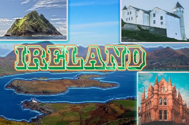 This is a postcard for Ireland. The mountain in the left corner is the mountain filmed in “The Lord of the Rings” movie. The image on the bottom right is a church in Dublin, Ireland. I added a stroke to the external images. I used inner glow, outer glow and stroke on the text. The Irish bay I did use bevel and emboss around the land.