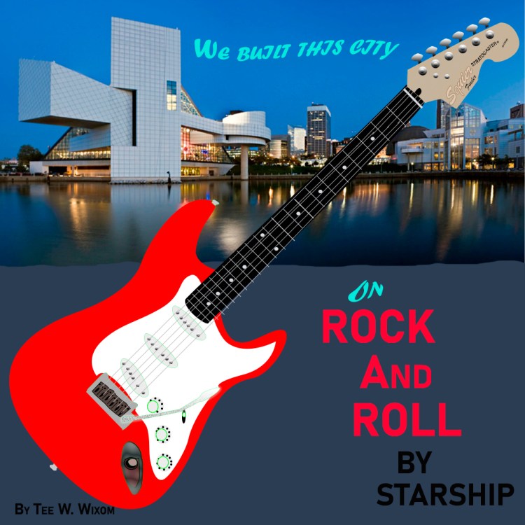 This is a postcard I made for Rock and Roll Hall of Fame. The background image is the image of the Rock and Roll Hall of Fame viewed from Lake Erie. The bottom of the background image is a drawn blue rectangle. Everything of the guitar was drawn in Photoshop.